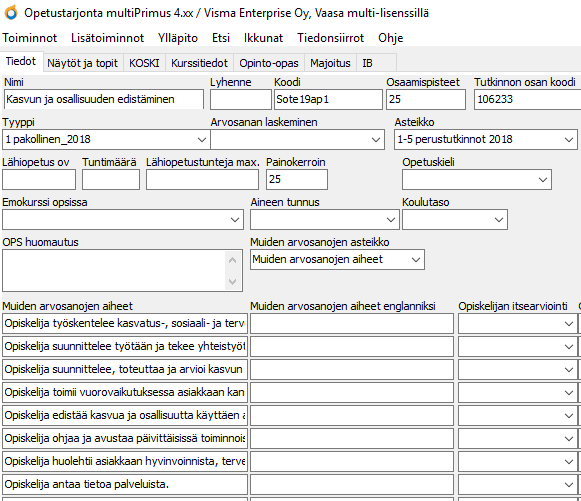 De inlärningsobjekt som ska följas upp (övriga vitsords ämnen) kan också användas i studerandens självvärdering. Detta görs med blanketten för studerandespecifika kursuppgifter, med vilken man ger studeranden rätt att göra självvärderingen enligt samma verbala bedömningsskala som lärarna använder för att följa utvecklingen.
