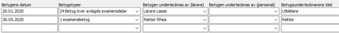 - I fältet Betygens datum ska man fylla i examensdatumet och på samma rad i Betygstyper-fältet ange "1 examensbetyg". Som bekräftelsedatum överförs i första hand datumet i Betygens datum-fältet, i andra hand Examensdatum. Det är inte obligatoriskt att fylla i betygstabellen, men där ser man smidigt alla betyg som personen har fått.