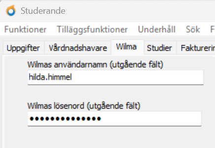 - Baserat på uppgifterna i fälten Wilmas användarnamn (utgående fält) och Wilmas lösenord (utgående fält) i Studerande-registret uppstår ett nytt användarkort i Wilmas användarnamn-registret. Följande uppgifter kopieras från studerandekortet till det nya kortet: