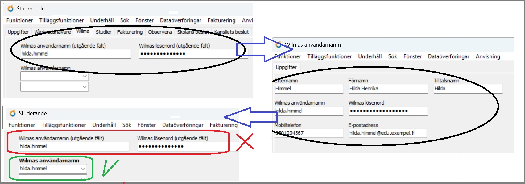 I fortsättningen går det inte längre att logga in i Wilma med elevens användarnamn av gammal typ (röda X-området på bilden). Personens aktiva Wilma-konto är istället det i fältet Wilmas användarnamn (markerat i grönt på bilden). Vid konverteringen kopieras användarnamn och lösenord exakt som de är, så ur Wilma-användarens perspektiv ändras inloggningsförfarandet inte.