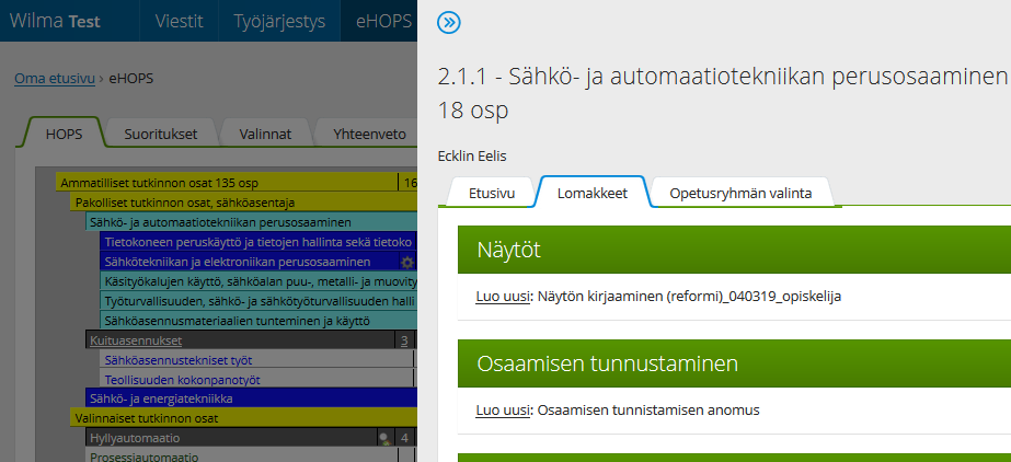 En studerande kan själv påbörja anteckningen av yrkesprov eller examensplan via sin PSP-sida i Wilma. När studeranden klickar på yrkesprovets kurs i sin PSP öppnas en sidopanel till höger. På fliken Blanketter i sidopanelen finns rubriken Yrkesprov och under den Gör nytt: _Blankettens namn_.