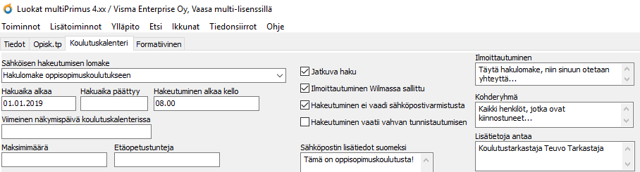 Skapa en ny utbildning i Klasser-registret, t.ex. Läroavtalsutbildning, och ha den aktiverad under hela året. Du kan lämna Inledningsdatum och Avslutningsdatum tomma, så syns inget sista ansökningsdatum i utbildningskalendern. I Ansökningstid börjar-fältet kan du lägga årets första dag (1.1.20XX).