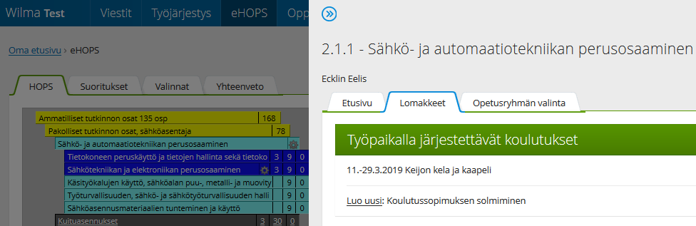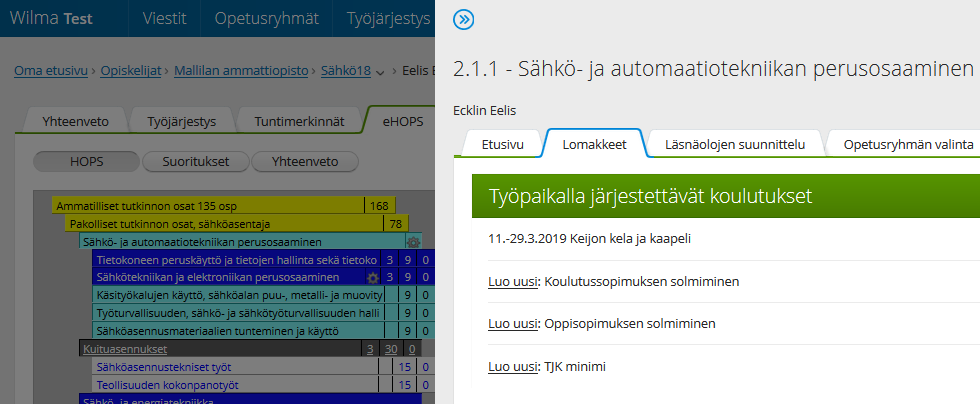 Från och med version 2.21 av Wilma kan studeranden också själv påbörja antecknandet av inlärning i arbete via sin ePSP-sida. För detta krävs en egen blankett: (modellblankett finns i Blankettbanken).