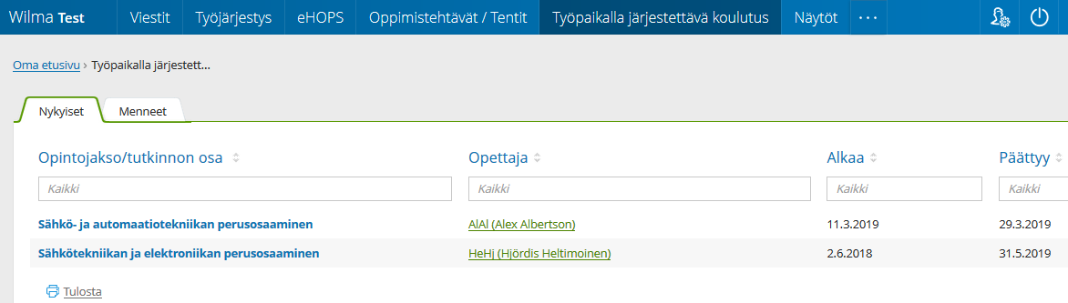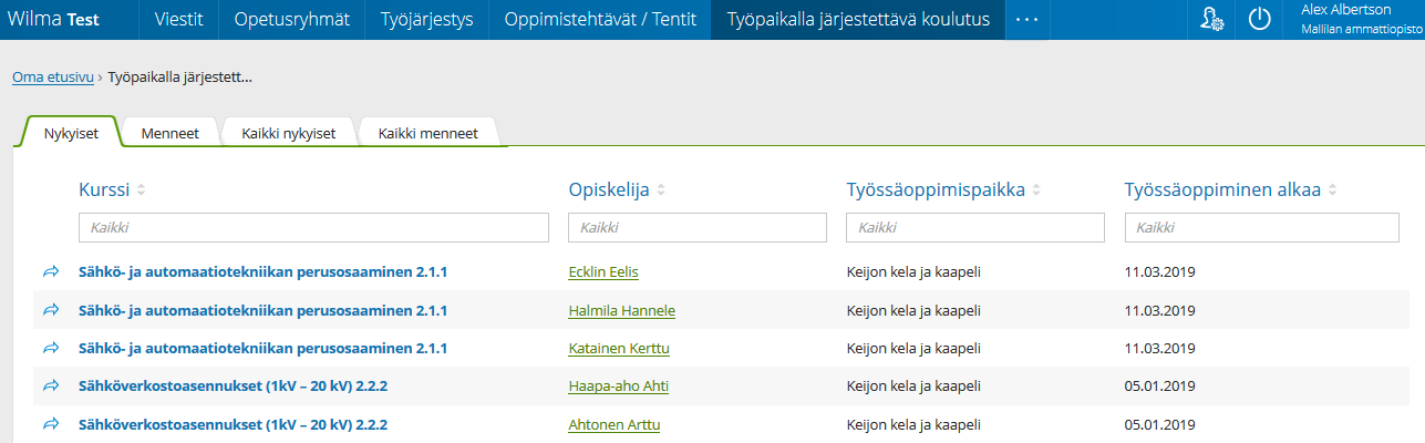 Man kan bearbeta uppgifter i ett tidigare antecknat avtal genom att välja det ifrågavarande utbildnings- eller läroavtalet länk i sidopanelen eller genom att välja Utbildning som ordnas på arbetsplatsen i Wilmas huvudmeny. Denna sida har listan över utbildnings- eller läroavtal som läraren är ansvarig för.