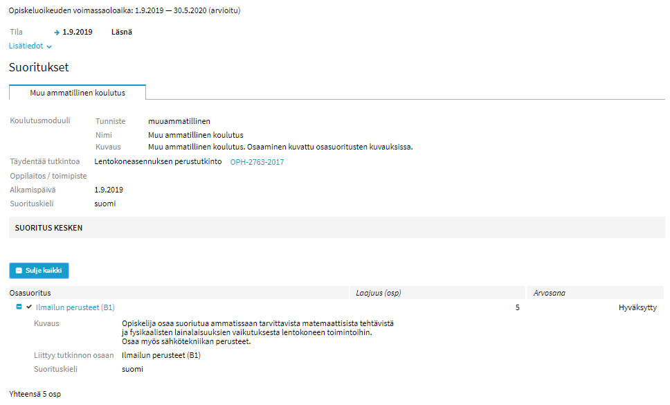 Övrig yrkesutbildning kan vara vilken som helst utbildning, och prestationer som ingår överförs alltid som lokala till KOSKI. För dem behöver man nödvändigtvis inte skapa en separat läroplan, utan man samlar prestationerna i läroplansvyn enligt det som varje studerande avlägger. Övrig yrkesutbildning kan vara antingen 1) Utbildning som förbereder för yrkesuppgifter eller 2) Lokal övrig yrkesutbildning.