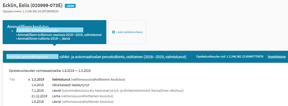 Utbildningsform överförs som tidsperioder: läroavtalets eller utbildningsavtalets inlednings- och avslutningsdatum som perioder från registret Utbildning som ordnas på arbetsplatser. OBS! Om läroavtalet visas endast tidsperioden, läroavtalsplatsen, FO-numret och den eventuella hävningsuppgiften här.