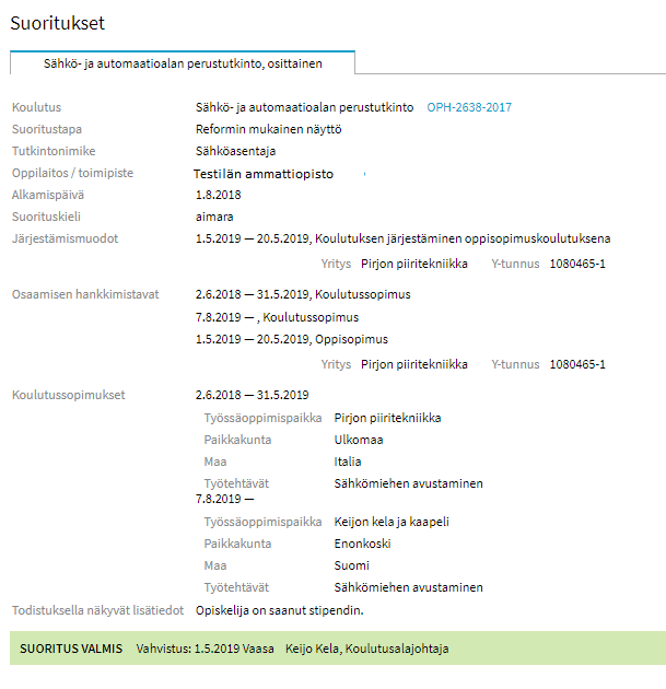 Bekräftande av prestation och utexaminering: I slutet av Prestationer-fliken visas prestationens status: PRESTATIONEN ICKE SLUTFÖRD eller PRESTATIONEN SLUTFÖRD. Om prestationen är slutförd, visas också bekräftelsen, dvs. datumet, orten samt bekräftarens namn och titel.