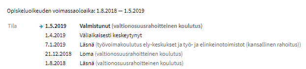 Status: Ifylls i Primus i första hand i tabellen över studerandearbetsdagar/timantal i fälten Timmar fr.o.m., Studierättens statusar, Deltidsprocent och Finansieringsform. Har man fyllt i flera rader i tabellen, överförs alla perioder till KOSKI, om status eller finansieringsformen ändras. Om tabellen däremot innehåller påföljande identiska rader (samma status och finansieringsform), överförs endast den tidsmässigt första av dessa identiska rader. I andra hand tas finansieringsformen från det enradiga fältet Studiernas finansiering, om det inte är ifyllt i tabellens Finansieringsform-fält.
