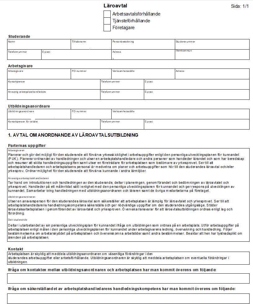 Läroavtalet är en tvåsidig utskrift. Med de utskrifter som finns i den här anvisningen kan du skriva ut ett läroavtal som ingås mellan en yrkesläroanstalt och en arbetsplats. Utskriften är uppgjord i enlighet med bestämmelserna i reformen. Man kan samla in de uppgifter som behövs på utskriften via Wilma, med den blankett som är framtagen för ändamålet.