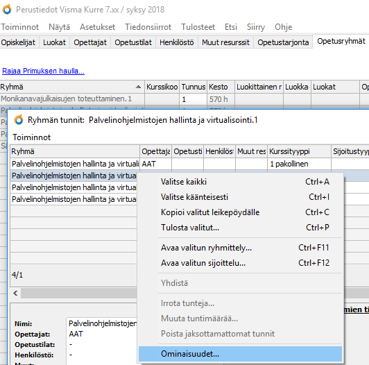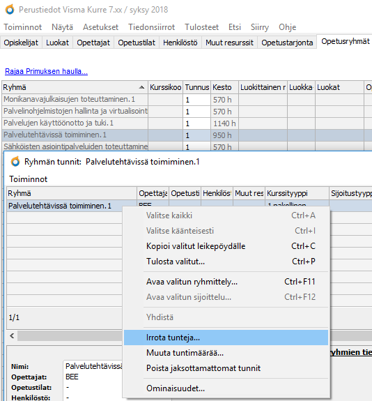 Öppna Grunduppgifternas Undervisningsgrupper (Grupper)-flik och aktivera den grupp, vars timantal du vill dela. Kontrollera att gruppen har rätt timantal eller rätt antal kompetenspoäng. Om du behöver ändra antalet ska du högerklicka på gruppen och välja Ändra gruppens omfattning. I rutan som öppnas kan du ändra kompetenspoäng till närundervisningstimmar eller ändra omfattning.