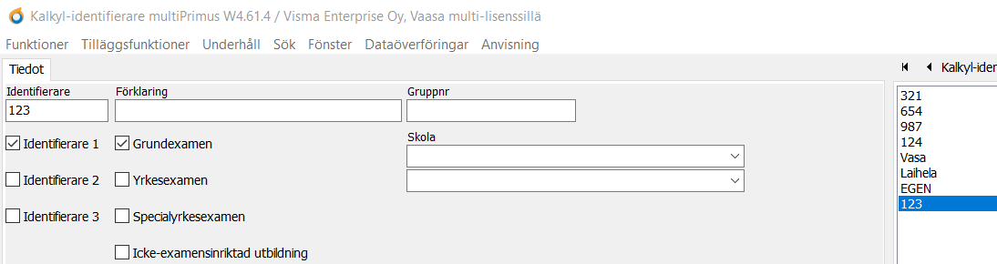 - Identifierare: En noggrannare indelning görs med hjälp av identifierare och de lägger man till i Primus register Kalkyl-identifierare. Enskilda studerandens identifierare utgörs av kostnadsställe, identifierare 1 och 2 och är i sin helhet i formatet "KS ID1 ID2".