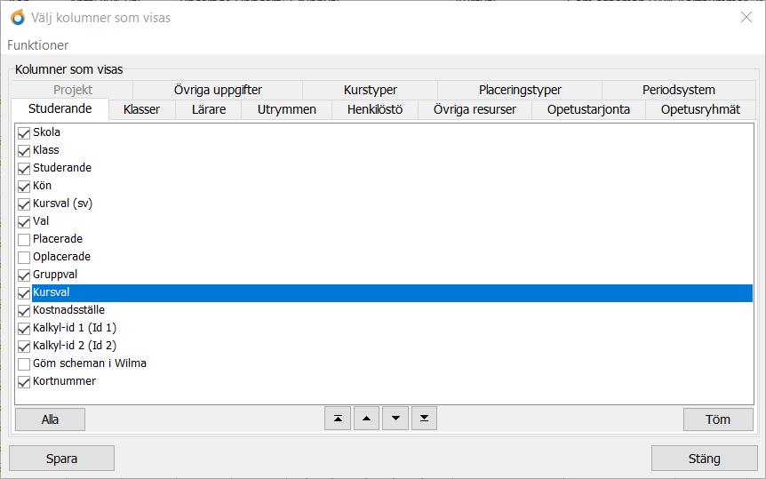 Identifierarna som har lagts till i Primus kan man också få fram i Kurre på samma flikar, men i kolumnerna Id 1, Id 2 och Id 3. För studeranden och klasser kan man endast använda identifierare 1 och 2, medan man kan använda den tredje för kurstyperna.