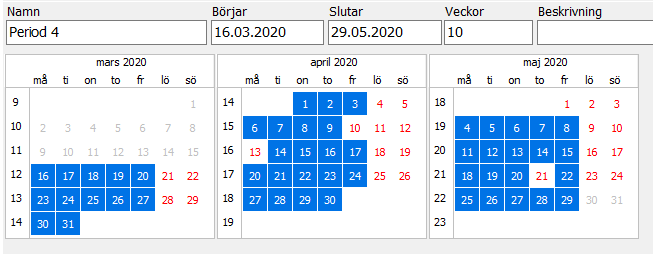 I bilden syns läroanstaltens period 4, med påsk, valborg och allhelgondag. Fredagen den 31.5. har reserverats för skolavslutning så då ordnas inte heller undervisning. I perioden finns alltså 10 måndagar, 11 tisdagar, 10 onsdagar, 10 torsdagar och 9 fredagar.