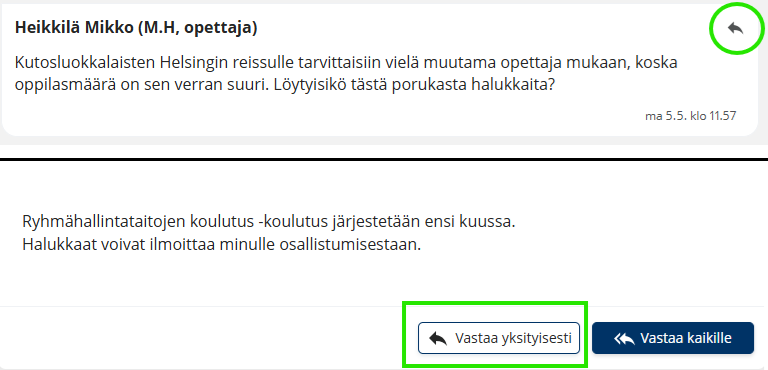 - Pikavastauksena lähetetty viesti ilmestyy alkuperäisen (tai mahdollisten muiden pikavastausten) alapuolelle. Viestiketju näkyy tämän jälkeen samanlaisena viestin alkuperäiselle lähettäjälle ja kaikille vastaaottajille. Pikavastausta käyttäen kaikki näkevät toistensa kommentit. Jos opettaja on lähettänyt viestin vaikkapa arviointiryhmälle MA2.1, näkevät ryhmän opiskelijat toistensa vastaukset. Jos opettaja ei ole sallinut vastaamista pikavastauksena, näkevät opiskelijat vain omat kahdenkeskiset keskustelunsa opettajan kanssa.